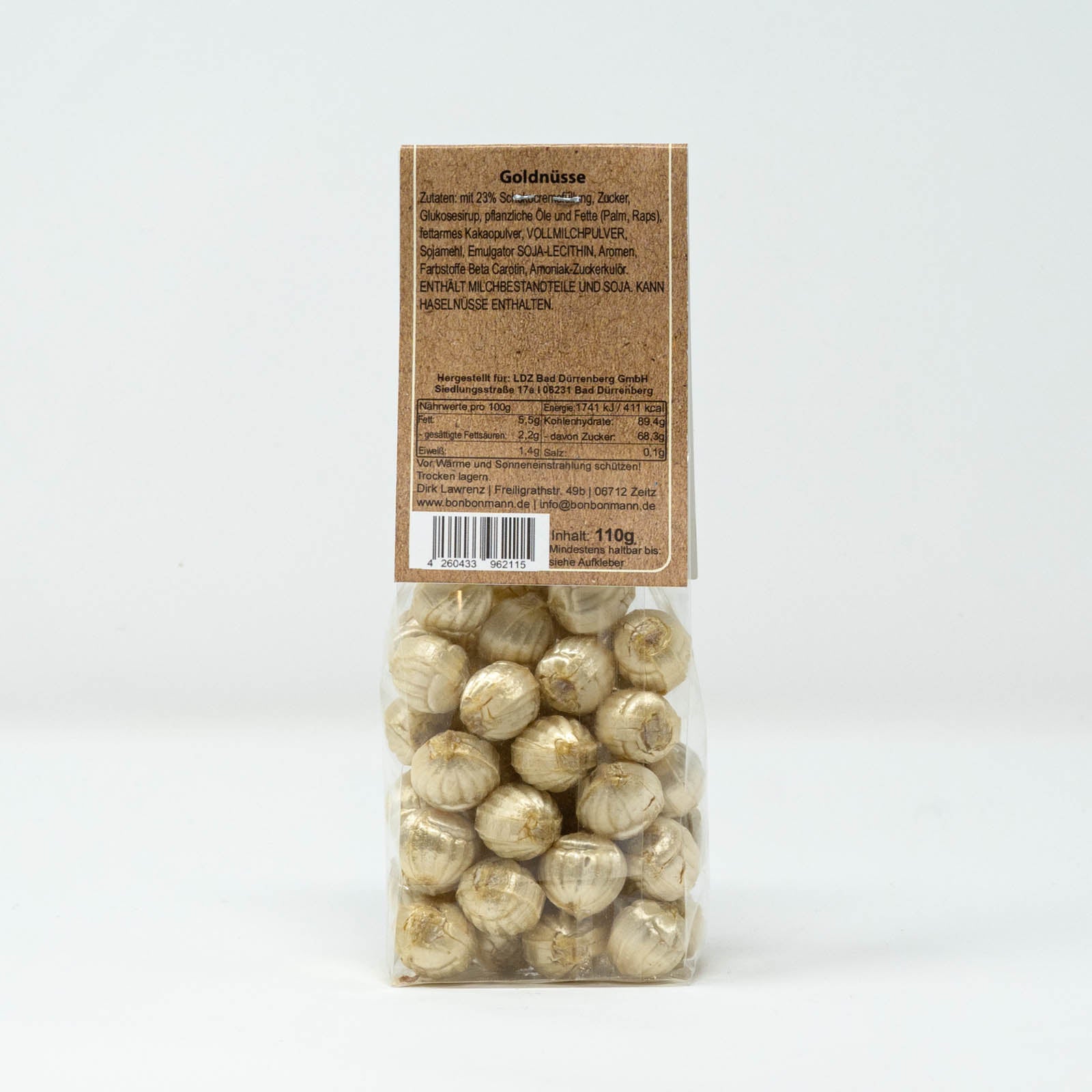Unsere Goldnüsse vereinen das Beste aus feiner Schokolade und zartem Knusperkern zu einem unwiderstehlichen Nascherlebnis. Mit 23 % köstlicher Milchschokolade umhüllt, überzeugen sie durch ihre ausgewogene Süße und das harmonische Zusammenspiel aus Zucker, feinem Kakaopulver und einem Hauch von Vanillearoma. Die sanft goldene Hülle macht sie nicht nur geschmacklich, sondern auch optisch zu einem besonderen Leckerbissen. Sie sind ideal zum Verschenken oder für den eigenen Genussmoment.